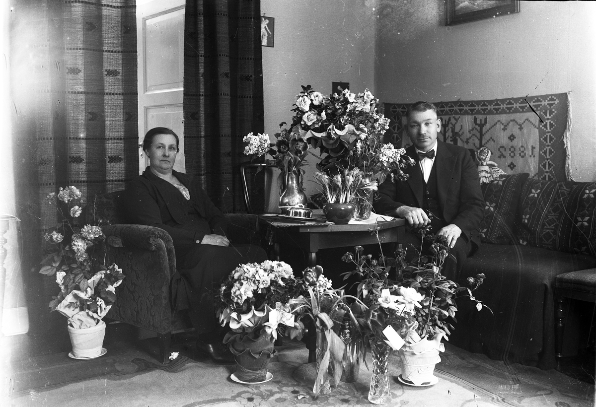 Foto av ett medelålders par som sitter i ett vardagsrum, omgivna av blommor.