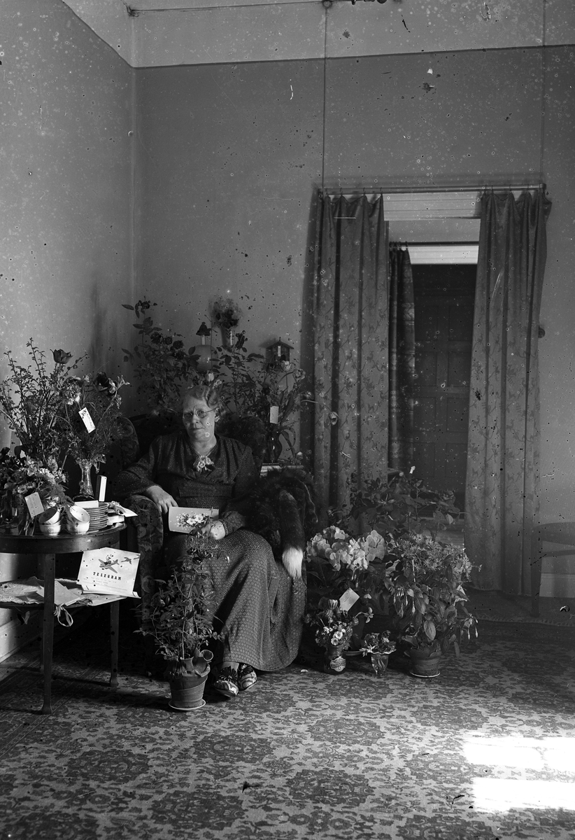 En äldre kvinna sitter i en fåtölj, omgiven av mängder med blomkrukor och blombuketter. Man skymtar också några födelsedagstelegram.