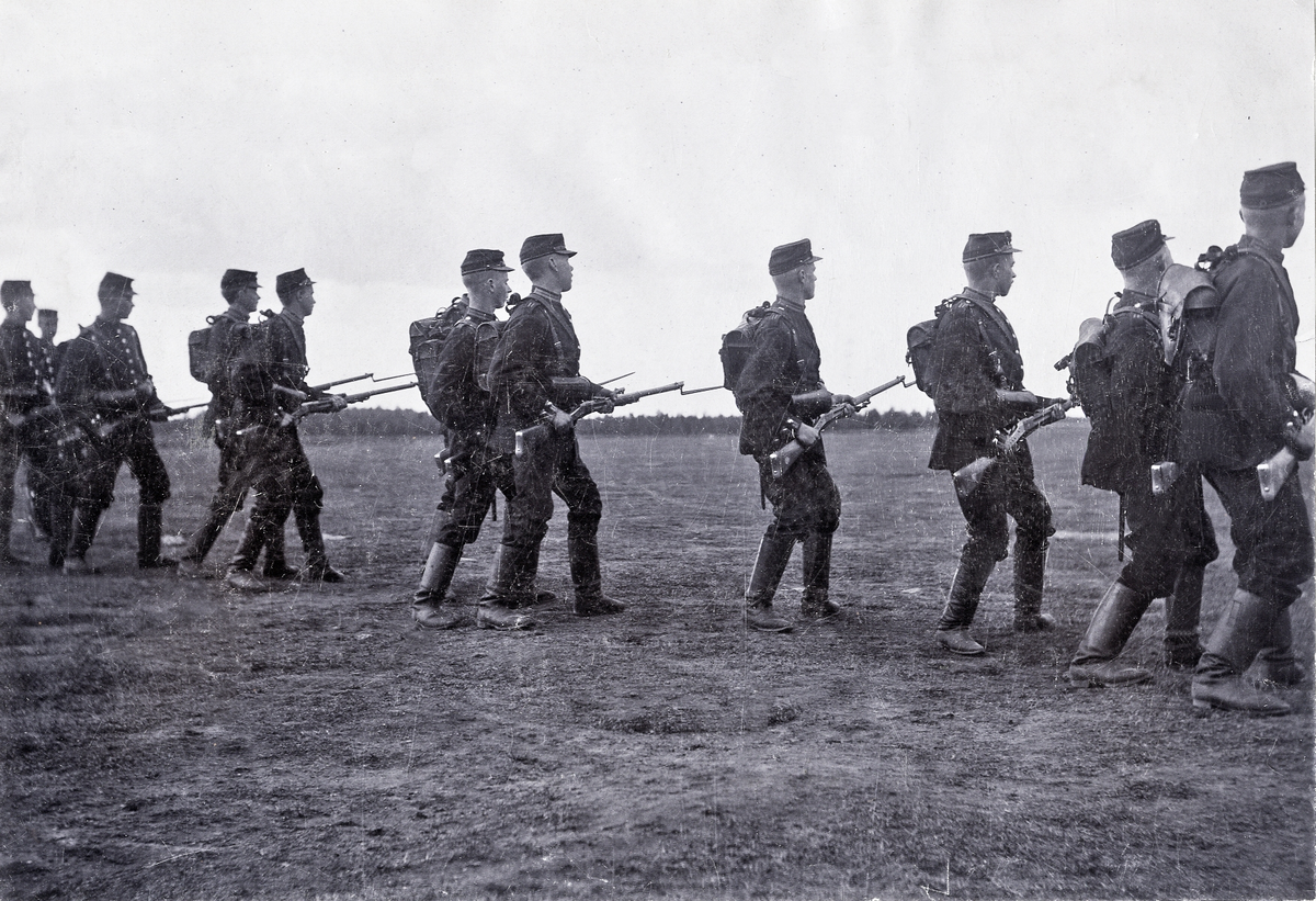 Övning i handgemäng. En grupp meniga rör sig över heden.