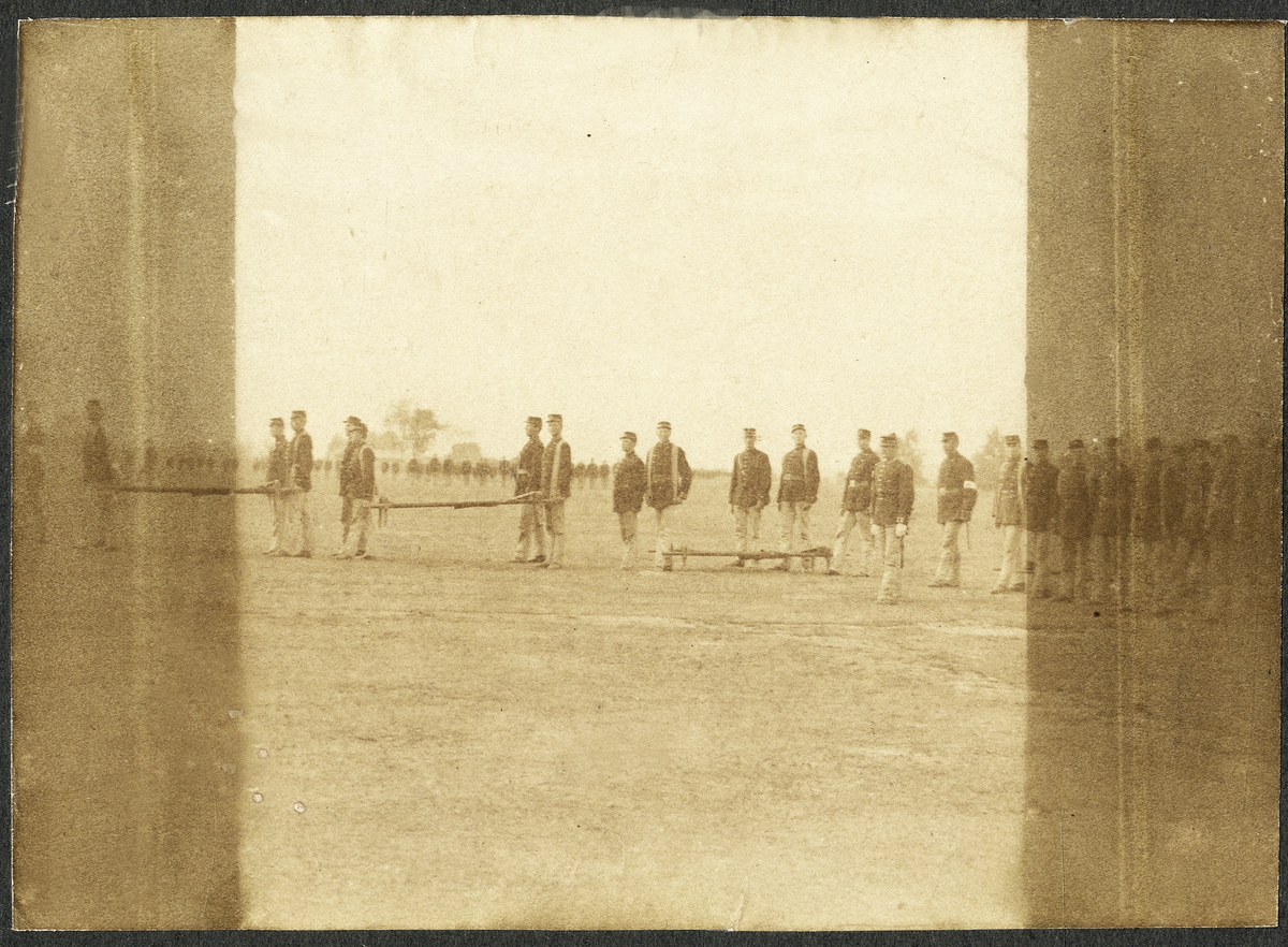 Text: "Sjukbärarna hava exercis. I bakgrunden "Prästkullen" och "Skarnen"".