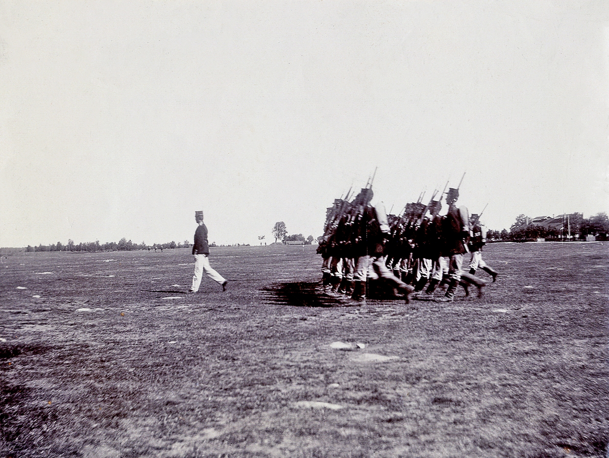 Eldexercis under dåv. löjtnant Carl von Platen. I bakgrunden skymtar några av byggnaderna på heden.