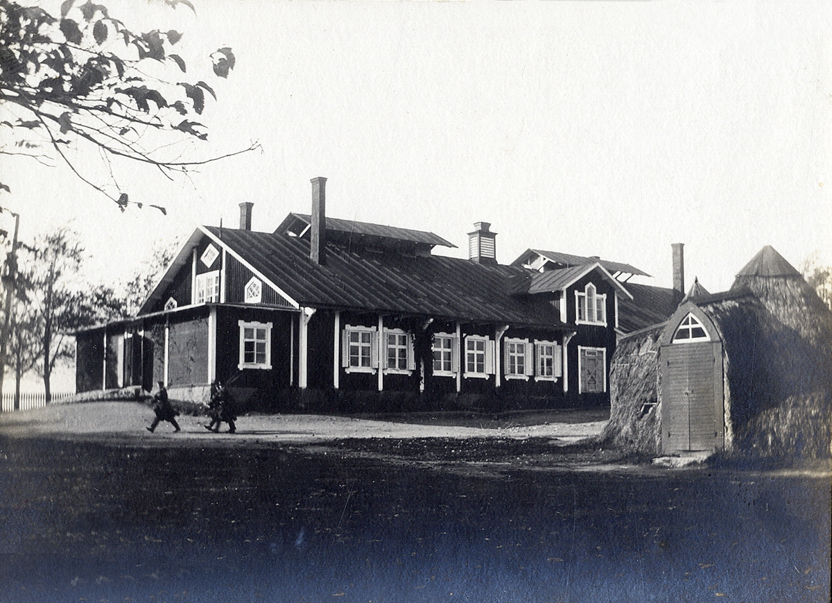 Den mindre baracken (Liv- och 2:a komp.). Till höger syns också en av de omtalade hyddorna.