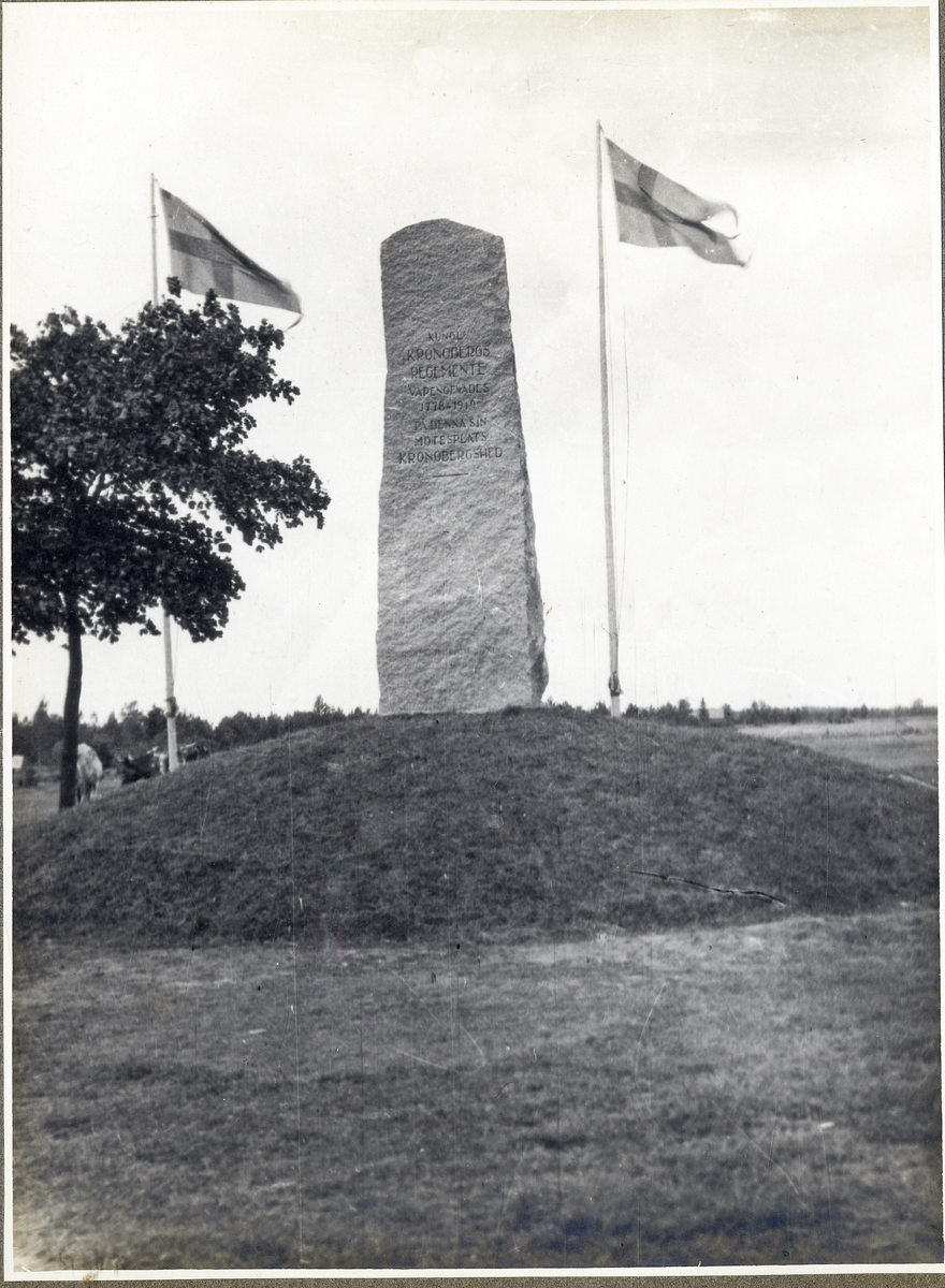 Minnesstenen (rest 1919) på Prästkullen. i bakgrunden heden och officersborgen.