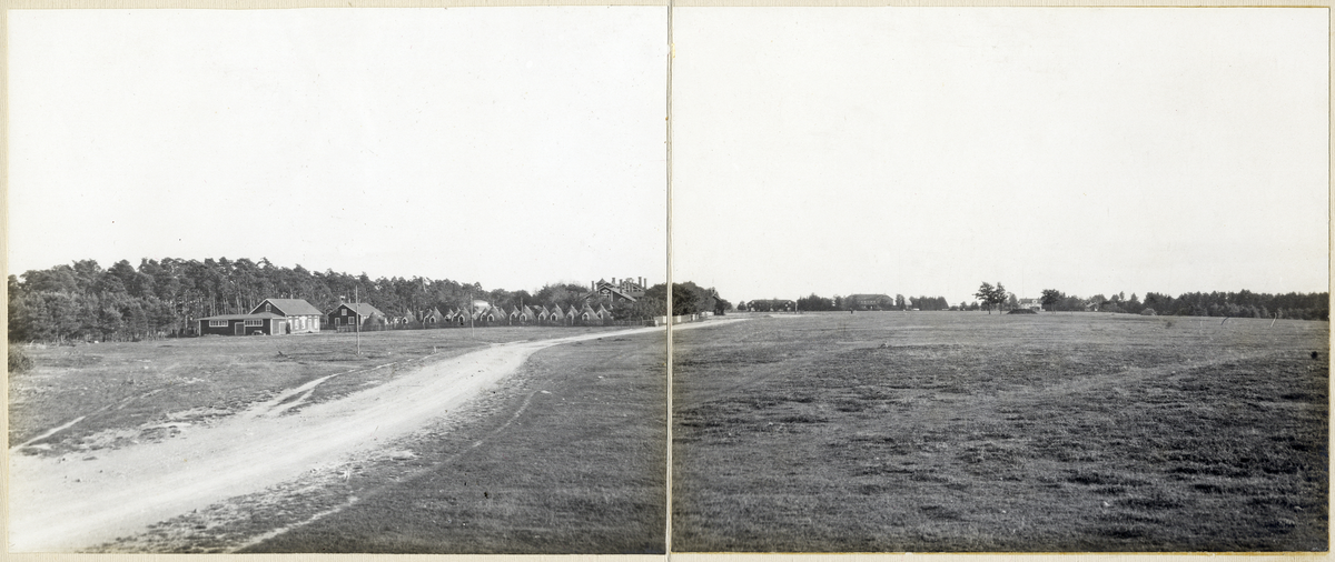Text på baksidan: "Till vänster lägret med bageri, marketenteri, halmhyddor och norra baracken. Till höger om landsvägsslutet huvudförrådet, officersborgen, underofficersborgen och längst till höger Tutaryd och skolhuset. Sjukhuset är skymt av träd.