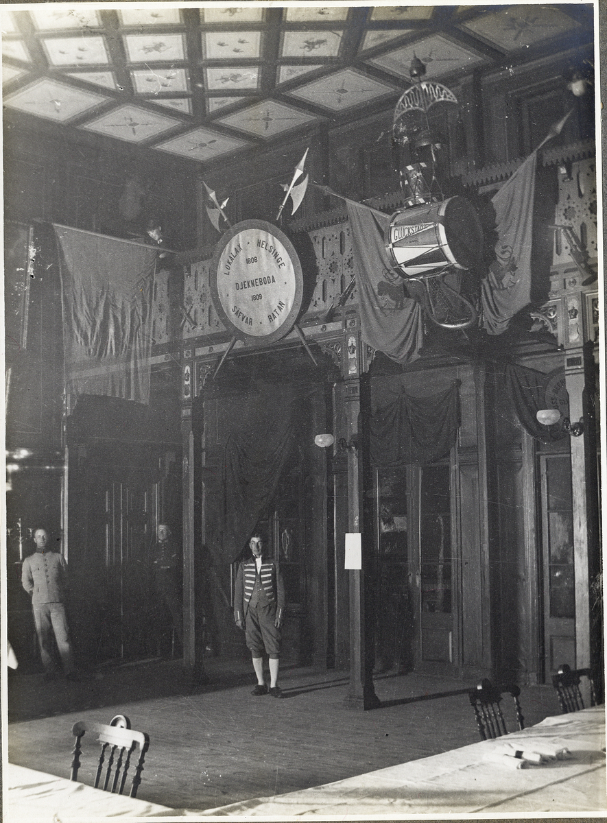 Tre män poserar för fotografen, varav en i livré, de övriga i m/06 och m/95. Ovanför dem syns musikläktaren med fanor och trummor m.m..
