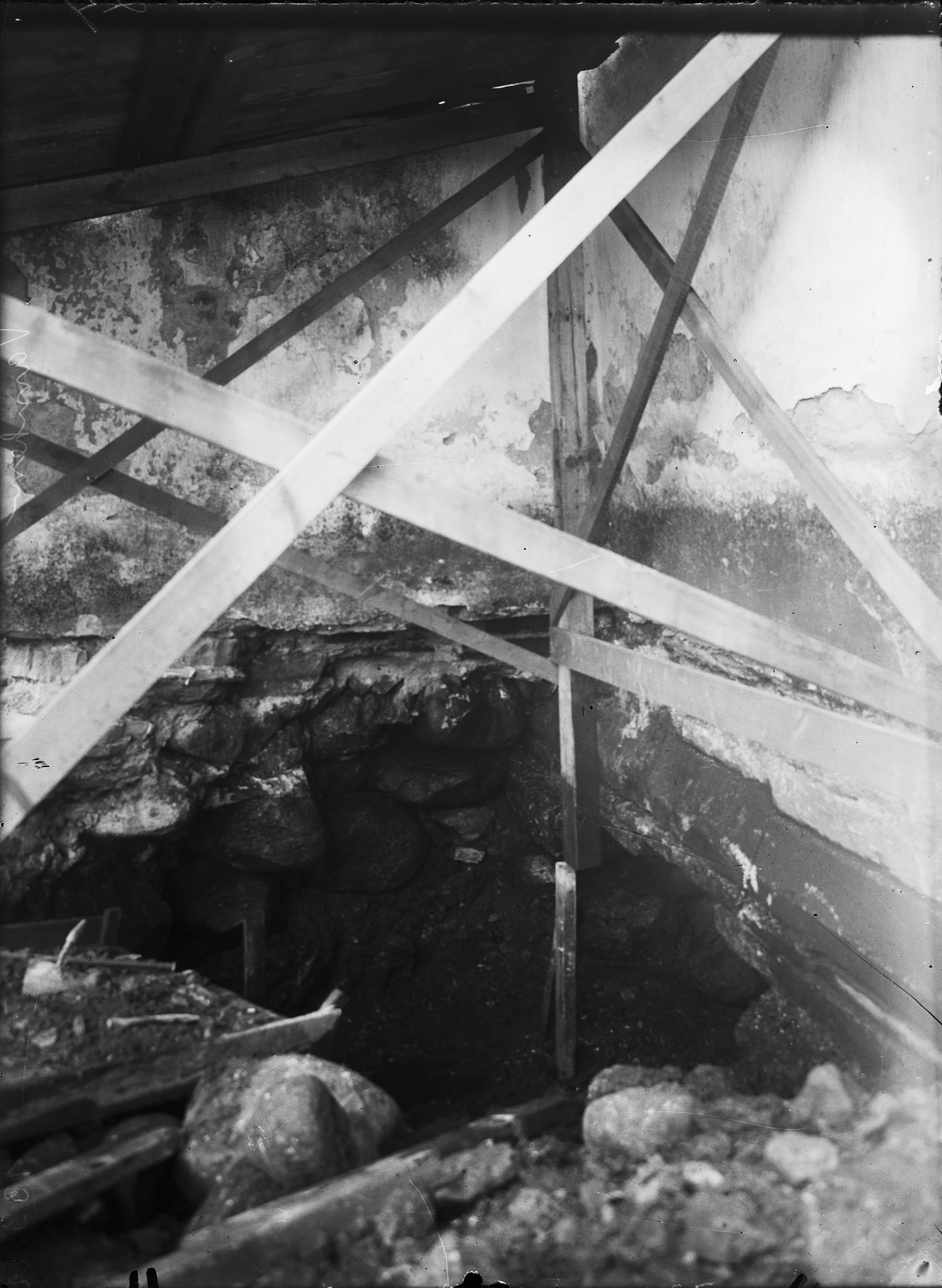 Norra fasaden, skarv mellan fasaden och den fjärde strävpelaren från väster, under grundförstärkning, från nordväst.