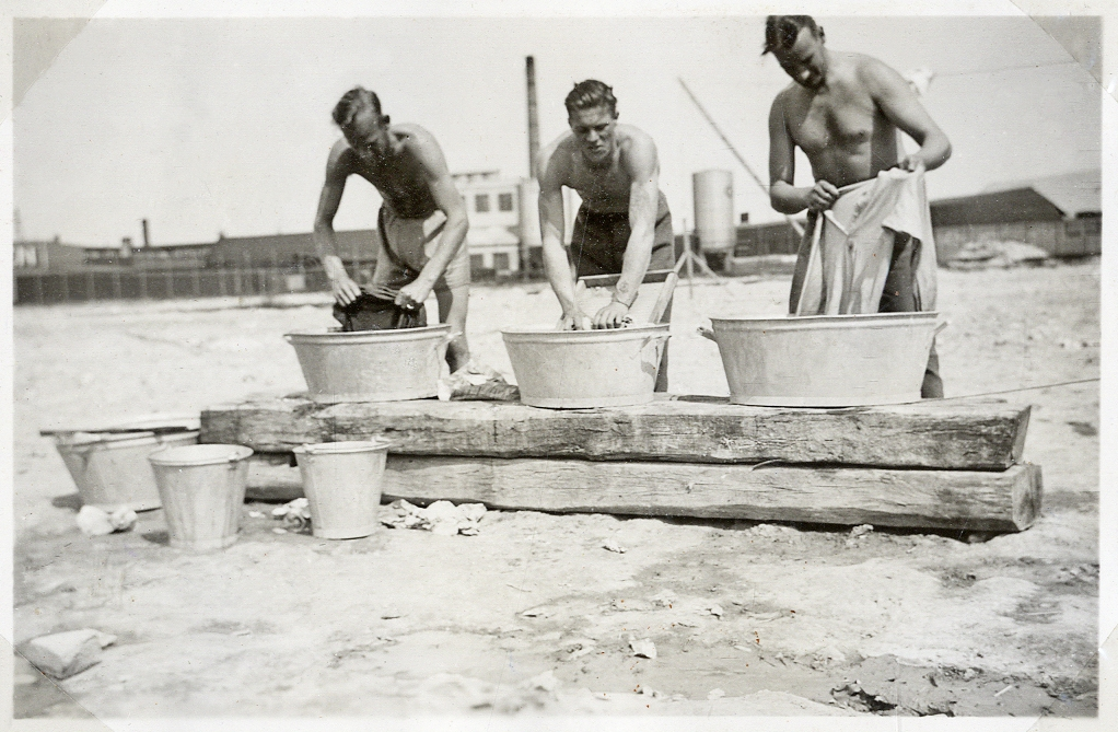 Tre man håller på att tvätta kläder i några zinkbaljor på en sandplan, troligen strax utanför Malmö.