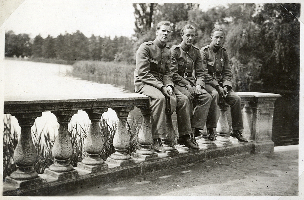 Tre mannar har satt sig att vila på en balustrad vid en sjö (slottsparken,Häckeberga?).