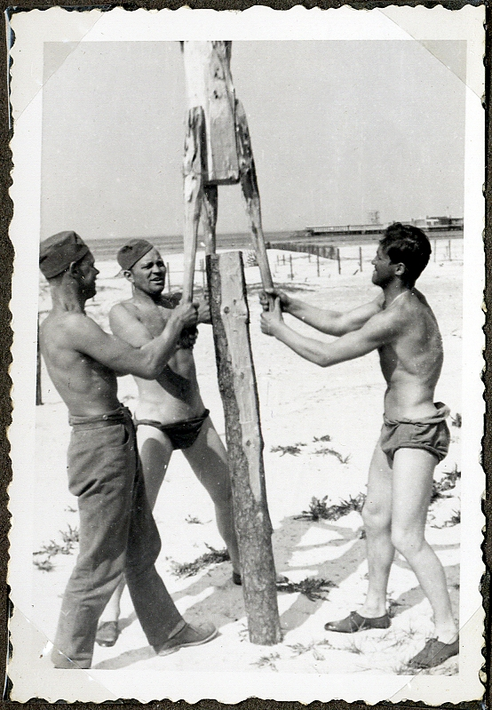 Tre mannar håller på att slå ner stängselstolpar på stranden.