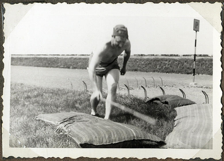 En man i badbyxa och uniformsmössa bankar dammet ur några dynor.