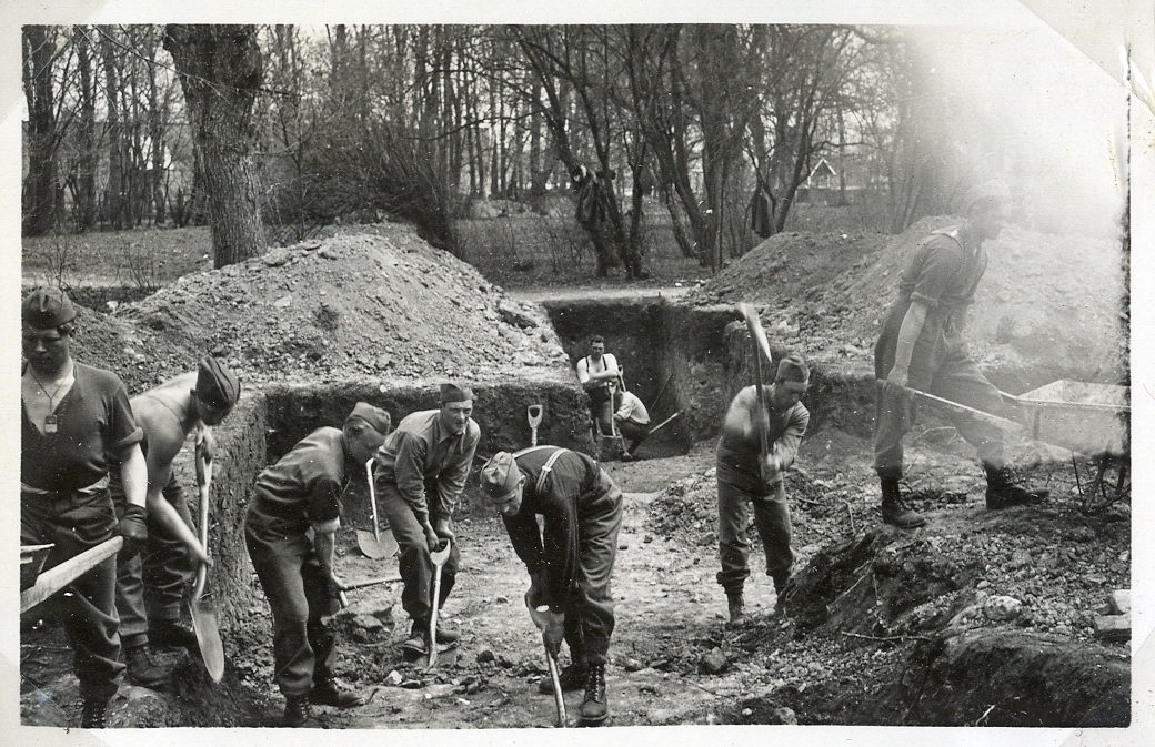 Grävning för skyddsvärn. I bakgrunden skymtar några bostadshus.