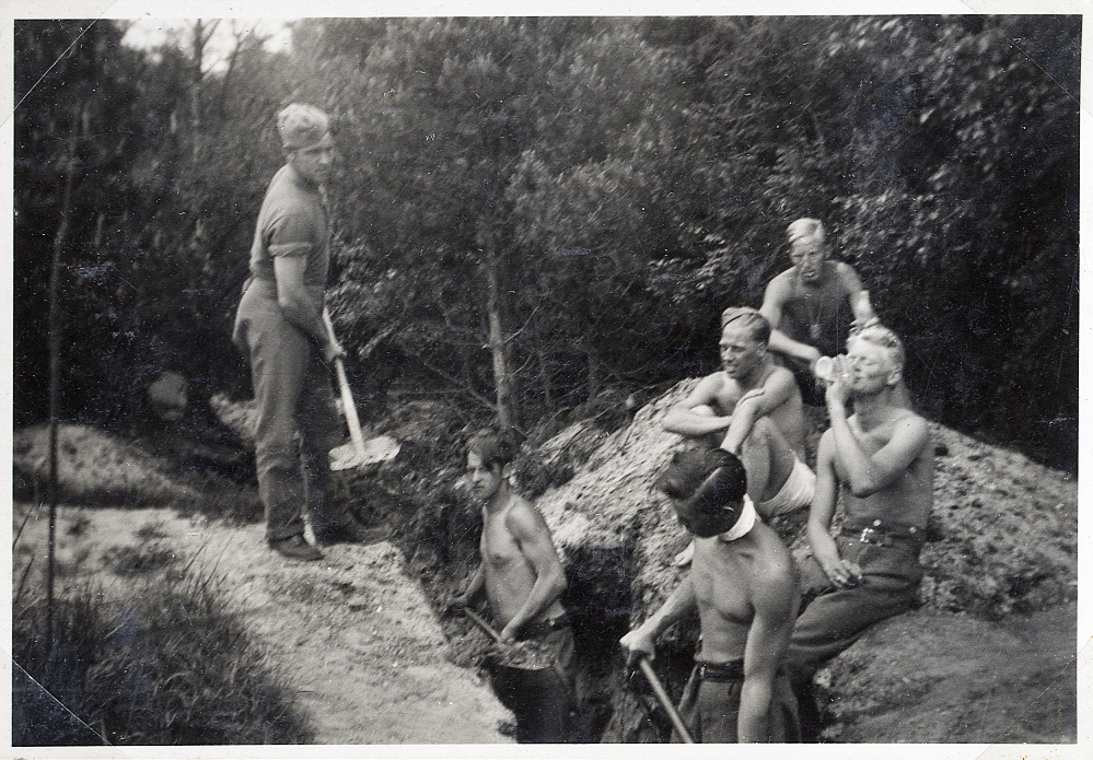 Arbete med att bygga ett skyddsvärn. En av mannarna passar på att ta en snabb paus och dricka något ur en flaska.