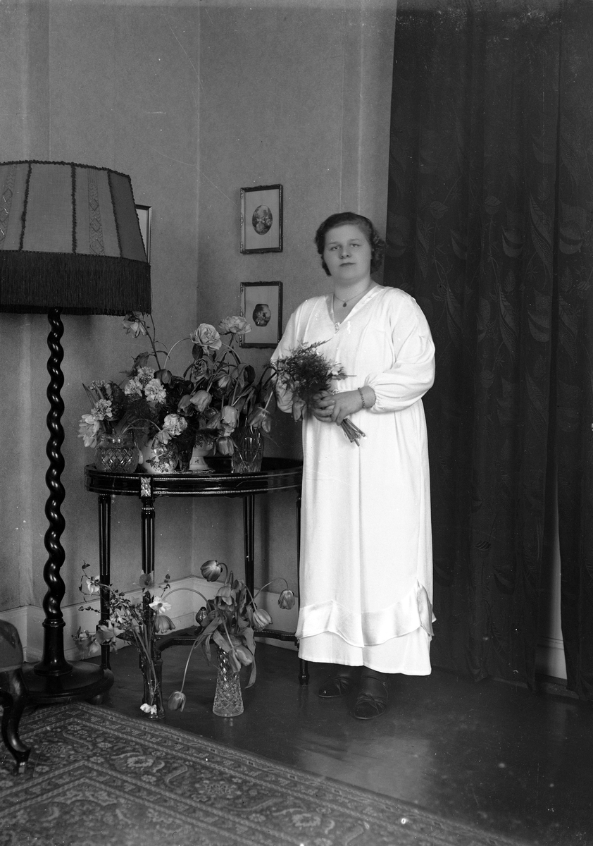 En kvinnlig konfirmand i vit konfirmationsklänning poserar för fotografen i ett vardagsrum.
