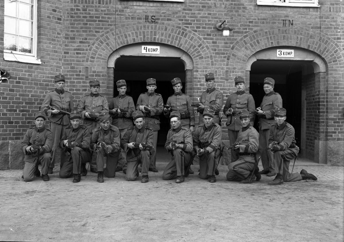 Titel: Foto av en pluton meniga med karbingevär utanför en kasern på I 11, Växjö.