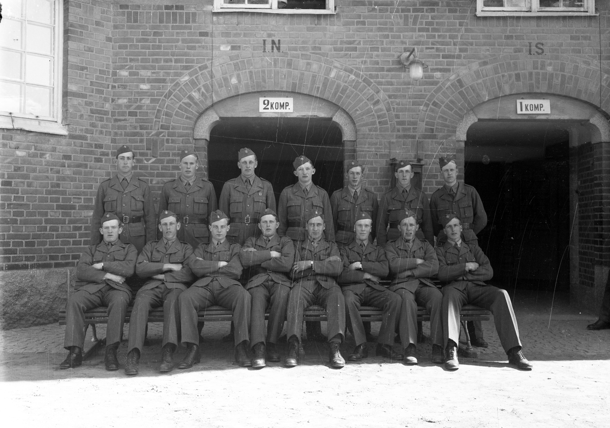 Foto av en grupp meniga i uniform, utanför en kasern på I 11, Växjö.
