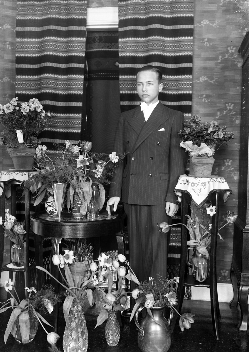 En manlig konfirmand i kostym står i ett vardagsrum, omgiven av blommor.