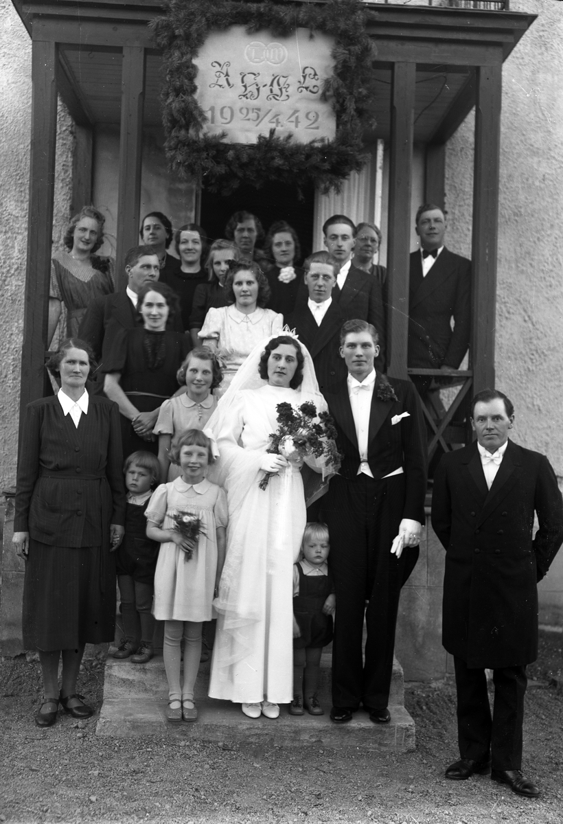 Ett brudpar med gäster har ställt upp sig för fotografen framför en enkel veranda. På verandan syns en bekransad skylt med texten: "AH (?) , EL, 19 23/4 42".