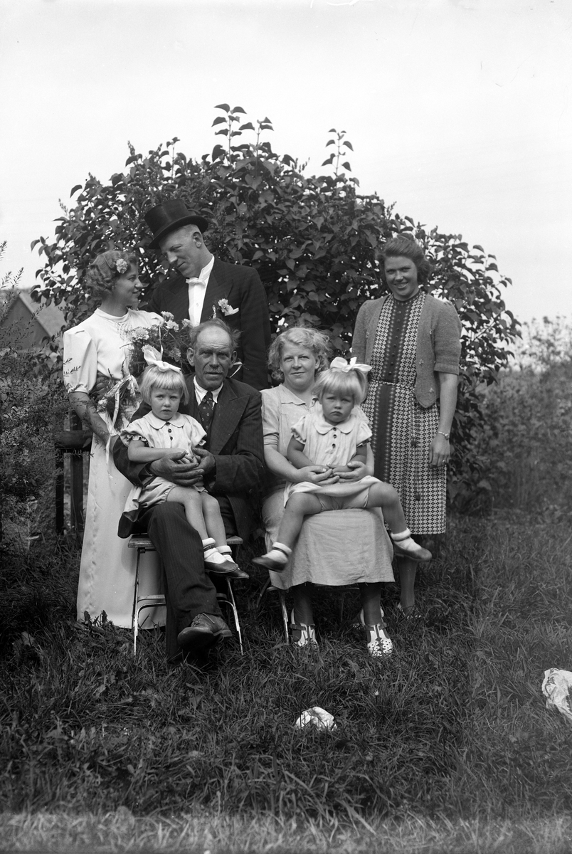 Foto av ett brudpar med familj, fotograferade i en trädgård.