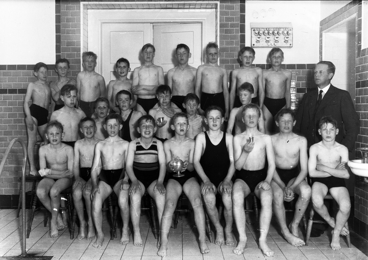 Foto av ett gäng pojkar, klädda i badbyxor. De har samlats i ett hörn av simhallen tillsammans med sin ledare.