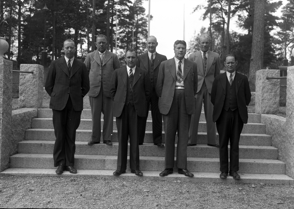 Foto av åtta okända herrar i kostym och slips, som står på en stentrappa till en park.