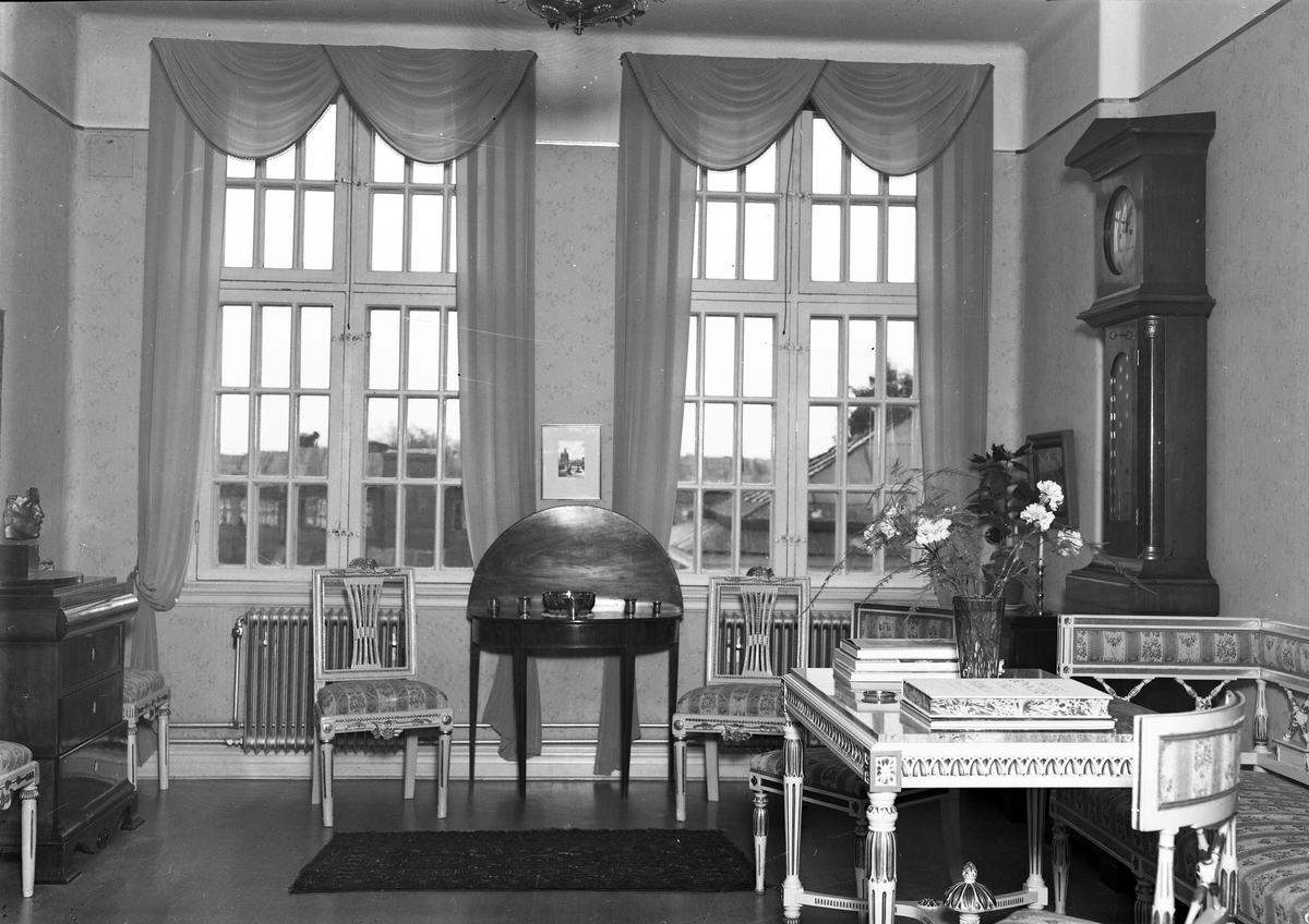 Foto av en salong med bl a ett möblemang i sengustaviansk stil och ett golvur.