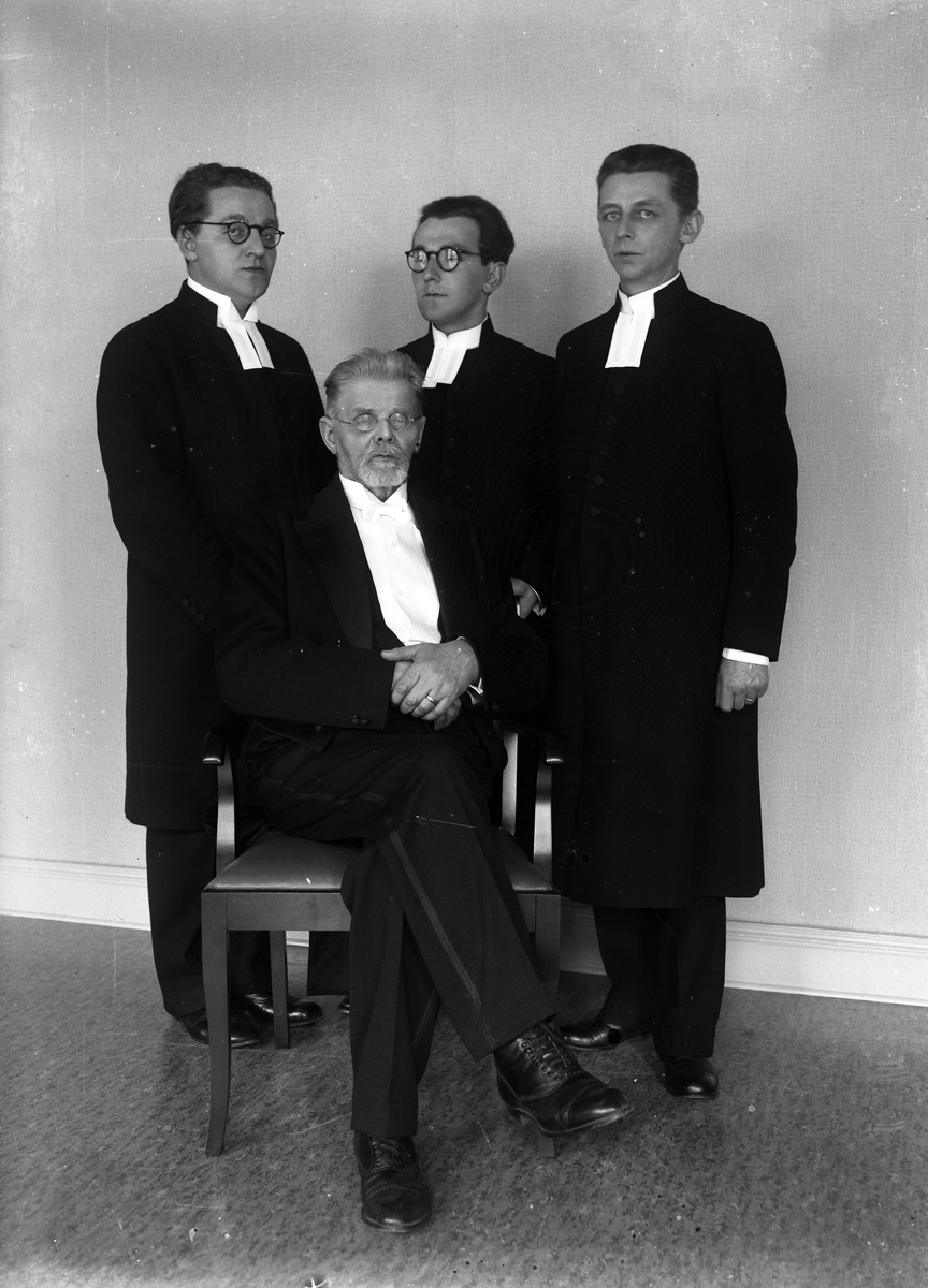 Foto av tre präster och en äldre man, klädd i frack.