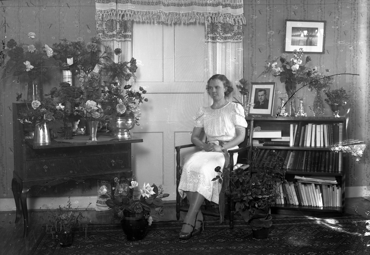 Foto av en ung kvinna i ljus klänning som sitter i ett vardagsrum, med en mängd blommor runt sig.