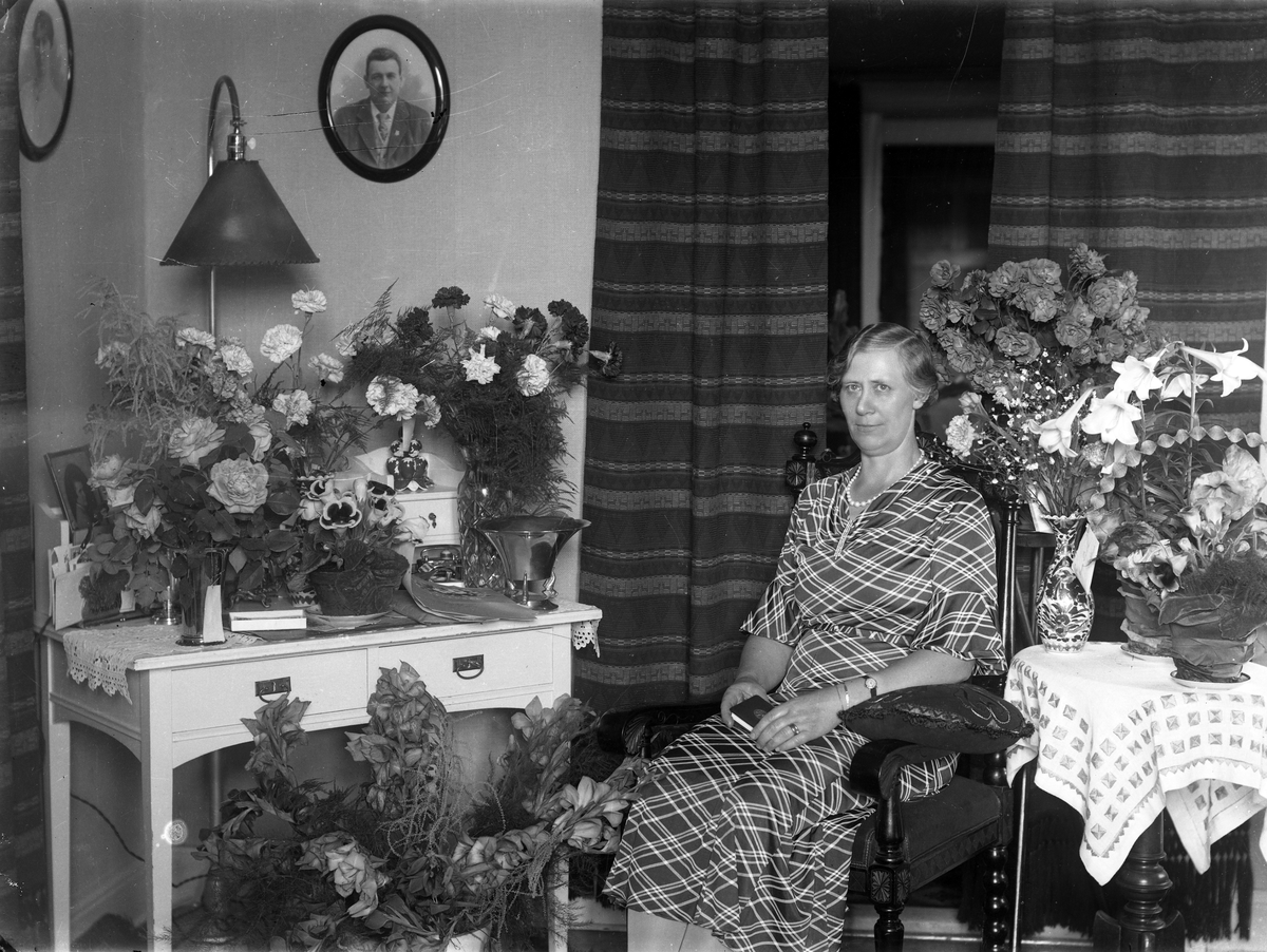 Foto av en kvinna i rutig klänning som sitter i en karmstol i ett vardagsrum, omgiven av mängder av blommor.