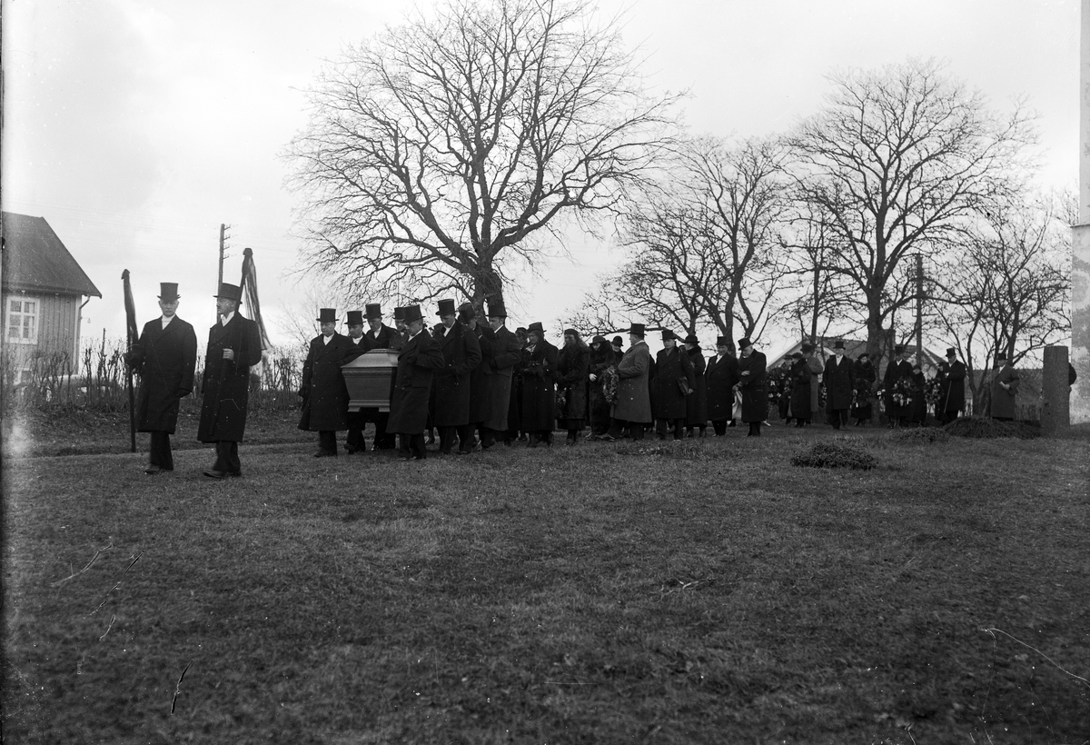 Foto av ett begravningsfölje på väg mot gravplatsen. I täten går några s.k. prestaver, följda av den burna kistan.
