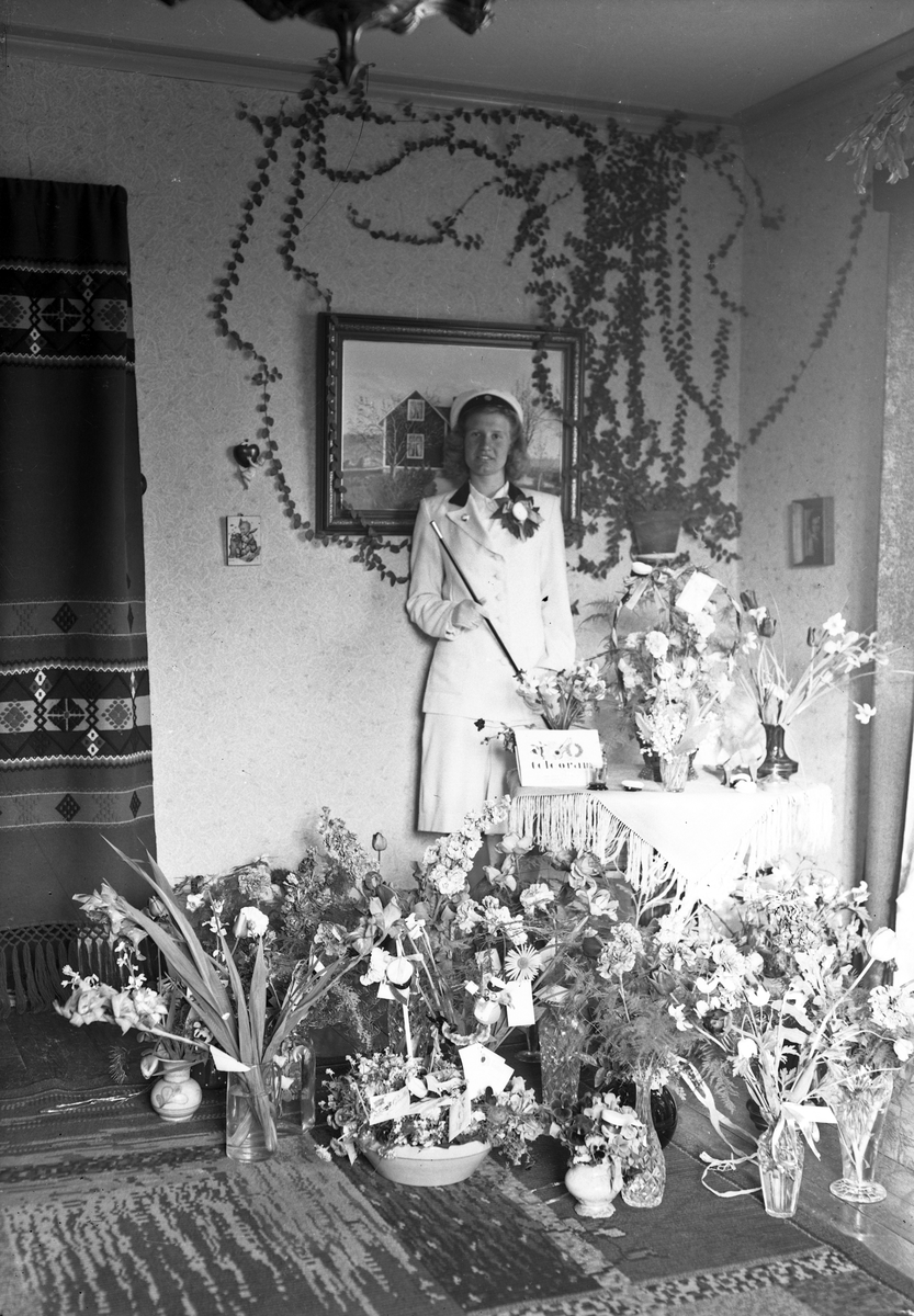 Foto av en okänd kvinna i ljus dräkt och studentmössa. Hon står i ett vardagsrum, omgiven av blommor.