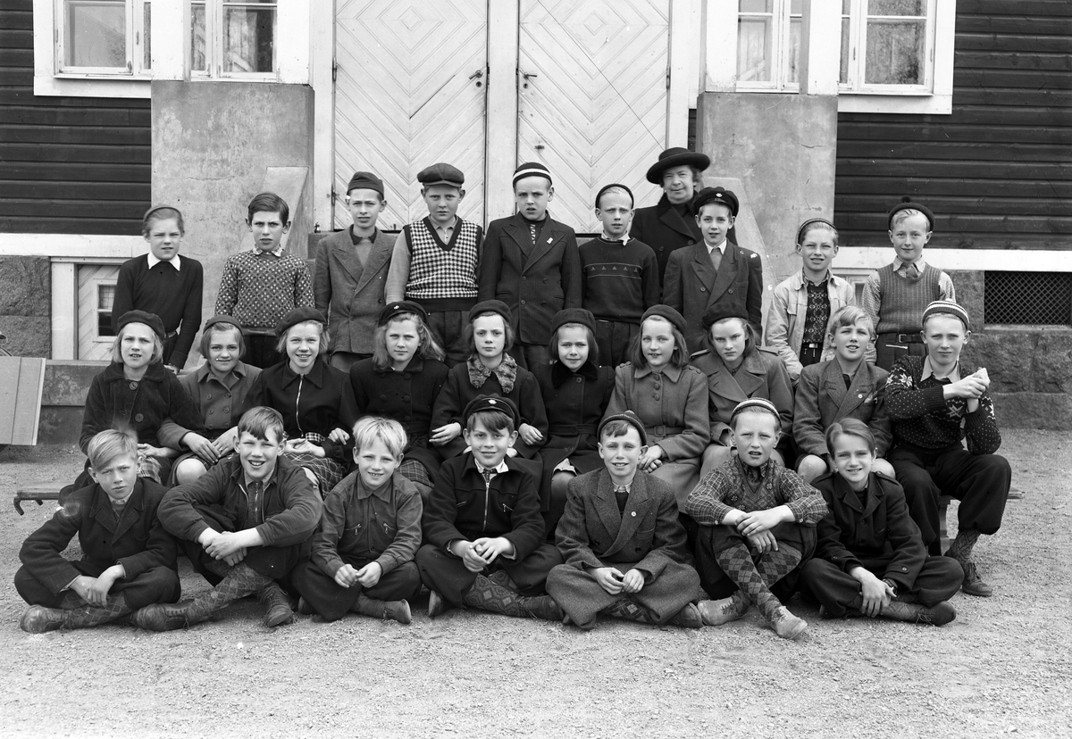Titel: Foto av en skolklass med lärarinna, som samlats utanför skolan.