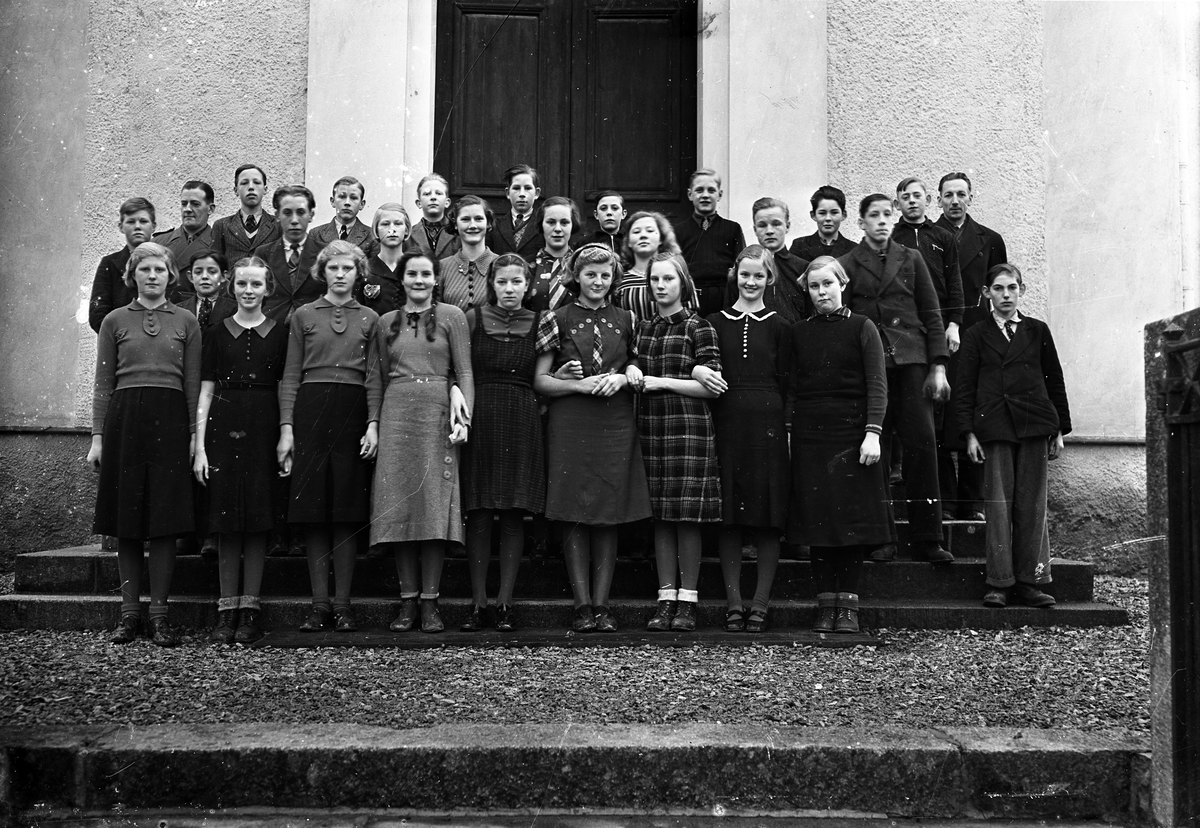 Foto av en skolklass med lärare, som samlats utanför skolan (?).