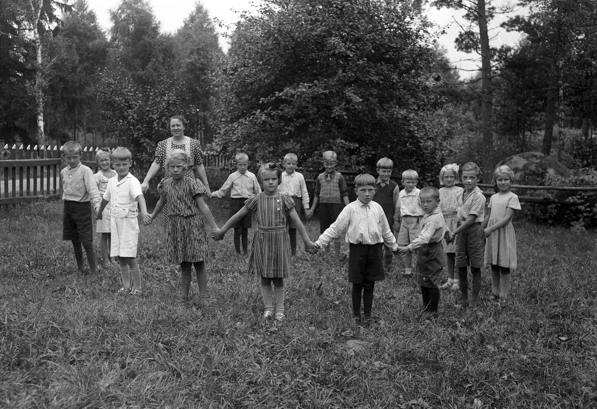 Foto av en skolklass (?) med lärarinna, som dansar ringdans i en trädgård.