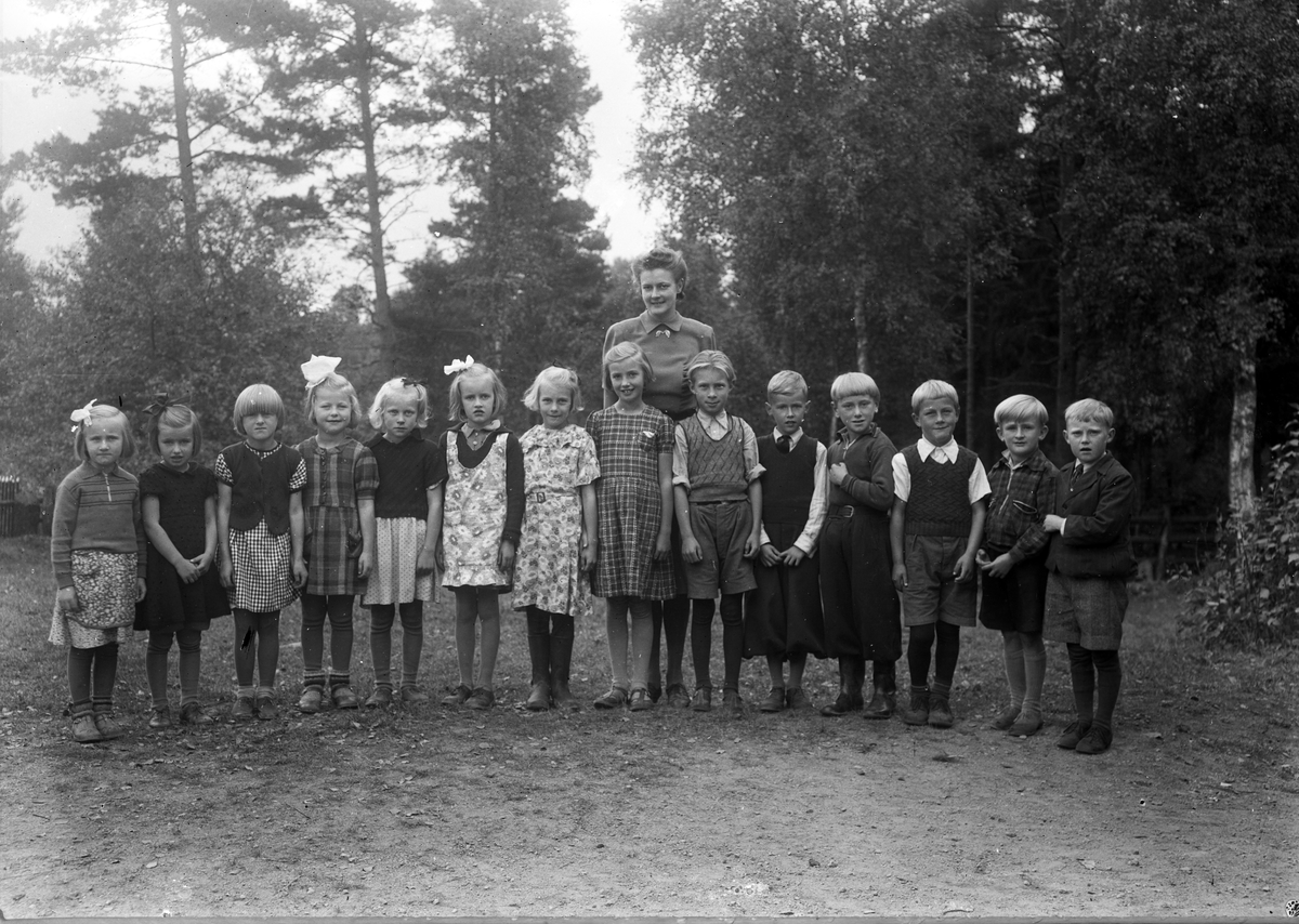 Foto av en skolklass med lärarinna, som samlats utomhus.