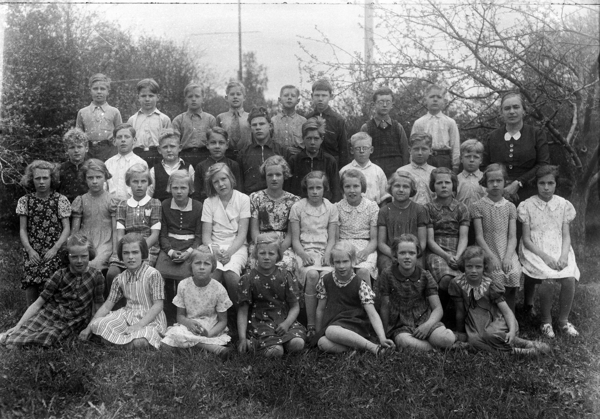 Foto av en skolklass med lärarinna, som samlats utomhus.