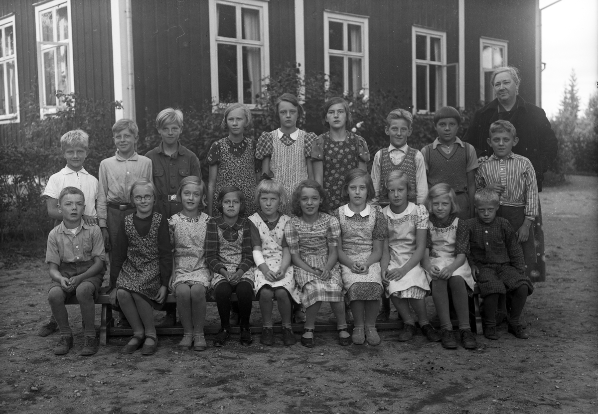Foto av en skolklass med lärarinna, som samlats utanför skolan.
