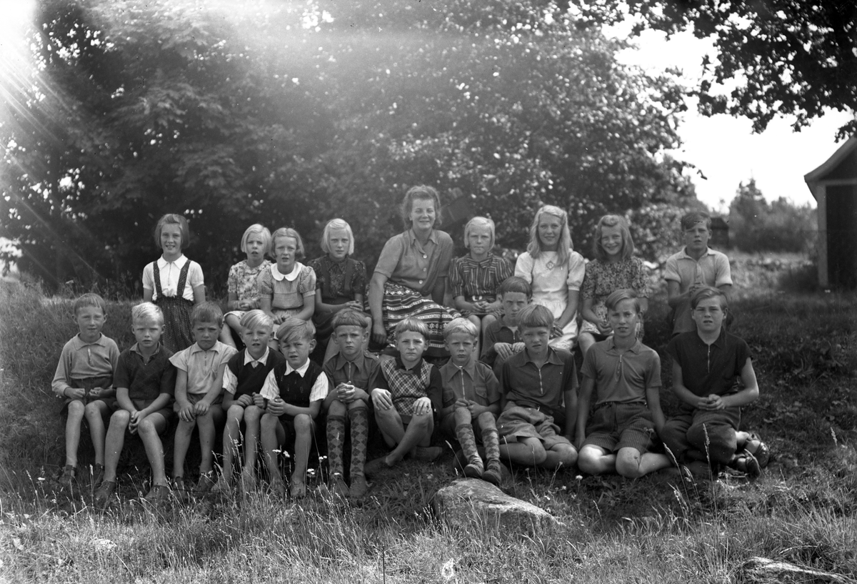 Titel: Foto av en skolklass med lärarinna, som samlats utomhus.