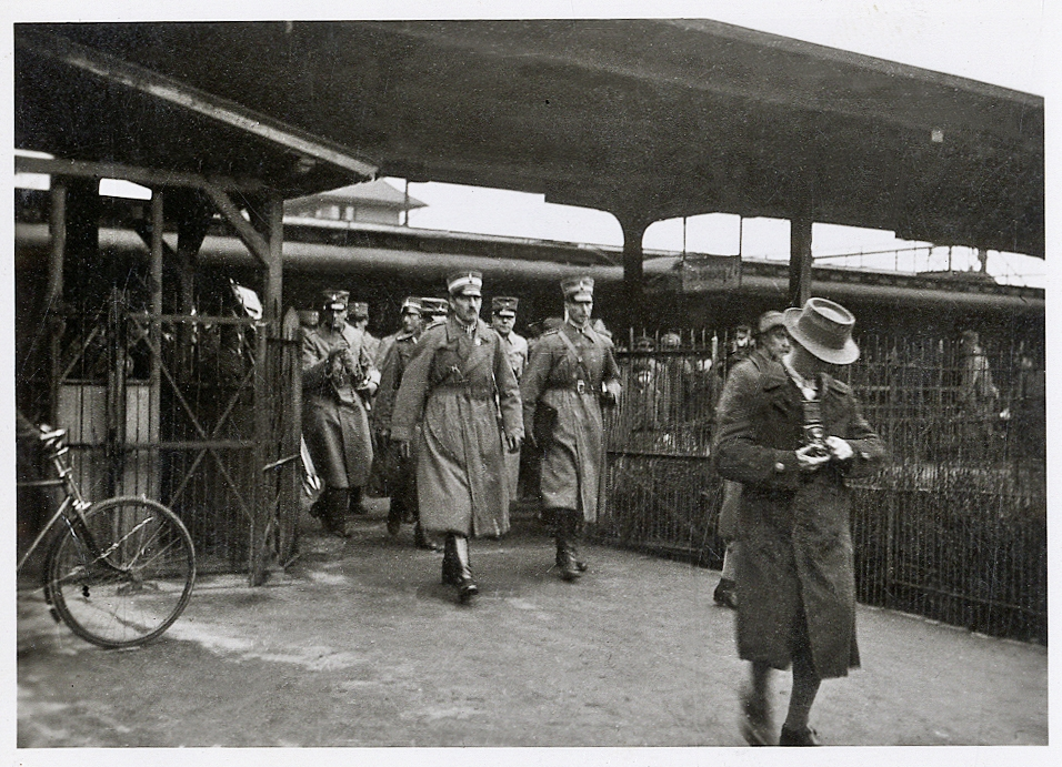 Ankomsten till Merzig, urlastning. Överstelöjtnant Nordensvan leder truppen, föregången av en fotograf.