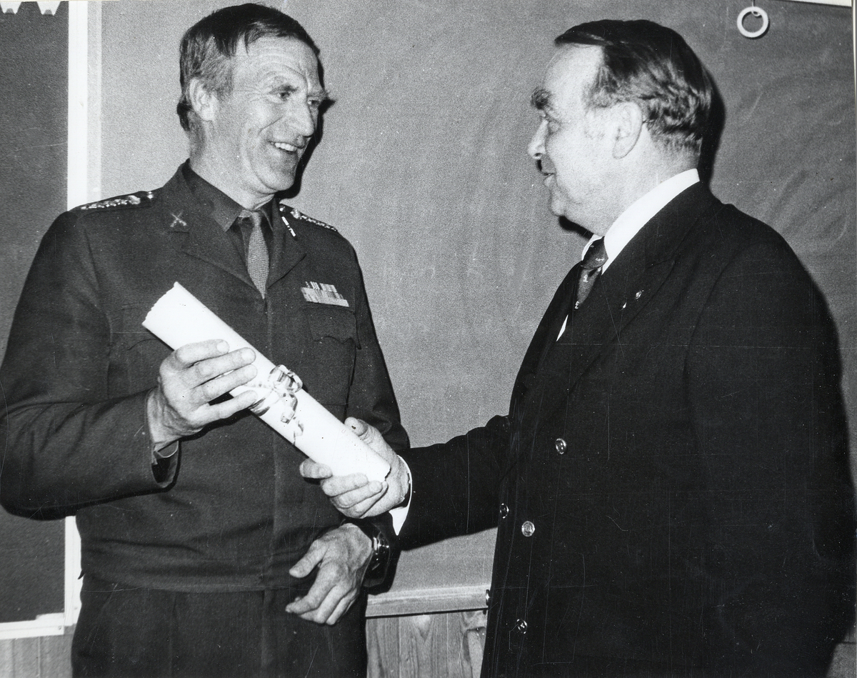 Ordförande i Malmöavd., bankdirektör K A Henriksson, överlämnar hedersmedlemsdiplomet till överste