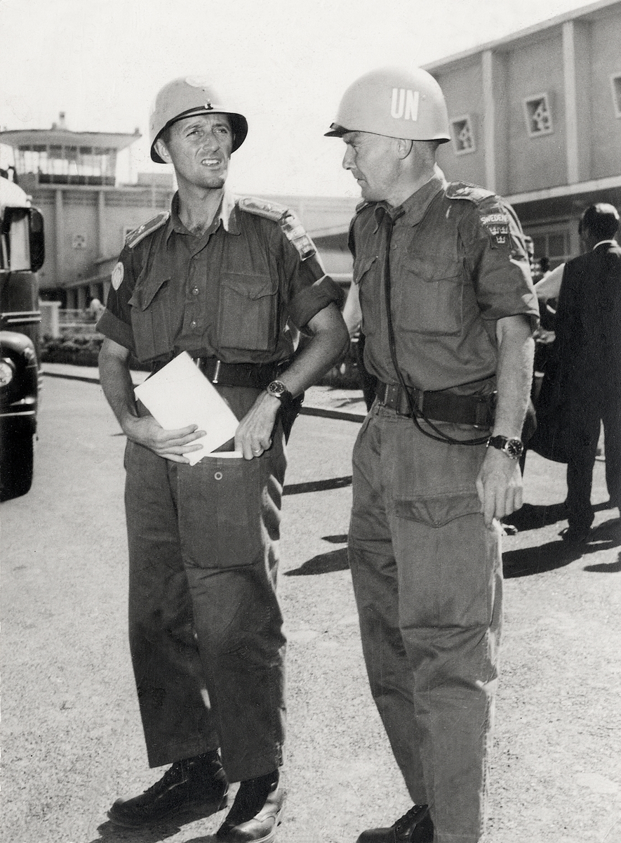 Överstelöjtnant Gunnar Syrén utanför en flygplats tillsammans med en annan officer, i FN-tjänst, Kongo (?), 1960-61.