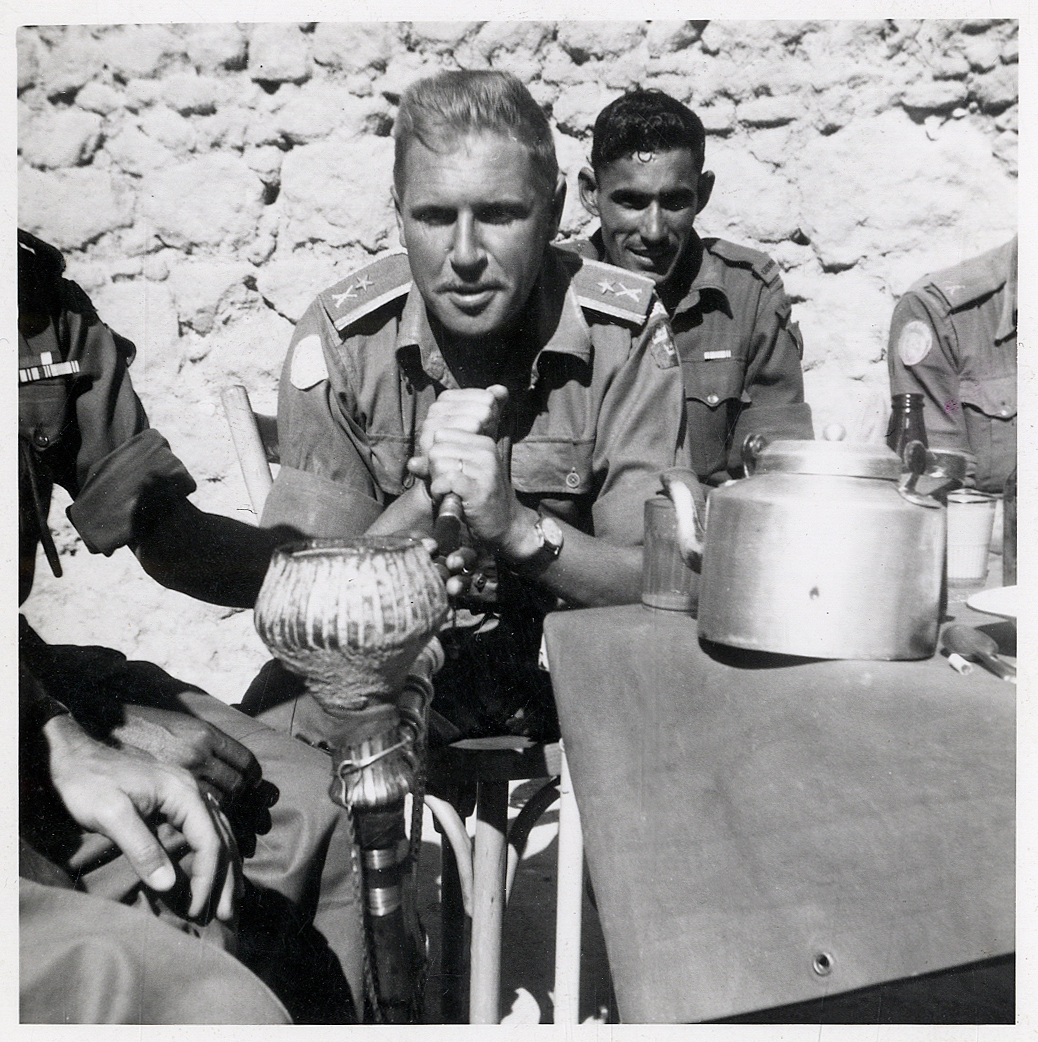 Major Kurt-Erik Amundson (FN-tjänstgöring i Gaza 1959-60) på besök hos 2.plut. Indiska A kompaniet, och blir bjuden på vattenpipa. Bakom Amundson syns korpral Tara.