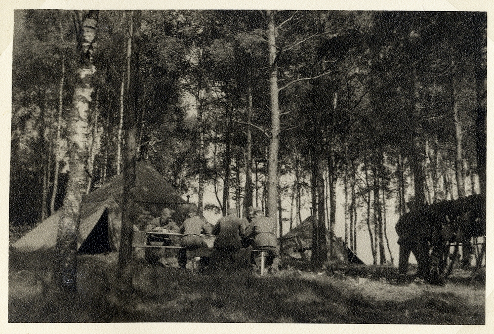 Några mannar sitter och läser vid ett enkelt trädgårdsmöblemang utanför några militärtält, trol.. vid Västersjön.