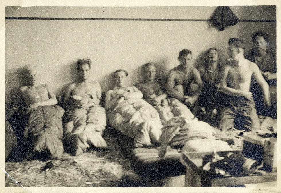 Några mannar ligger uppradade i sovsäckar, trol. i en skolsal.