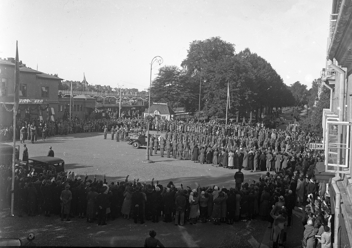 Gustaf V anländer till Växjö och tar emot I 11:s regemente utanför järnvägsstationen.