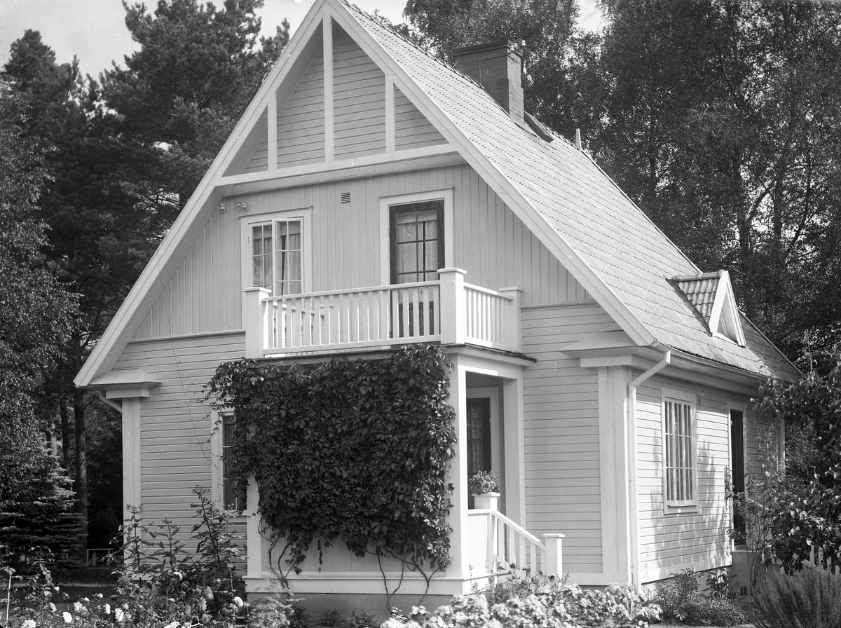 Foto av en gulmålad trävilla i trädgård.