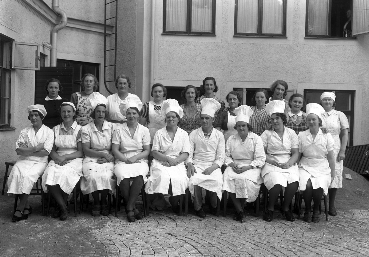 Foto av kökspersonal, många i full mundering, som samlats för fotografen på en innergård.