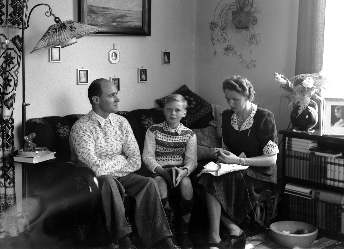 Foto av en familj med en pojke, som samlats i ett vardagsrum.