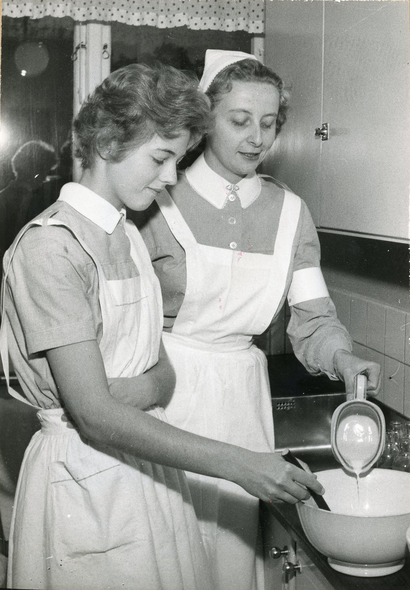 Fotografi på första barnsköterskekursen 1:a september 1959, full fart i mjölkköket.