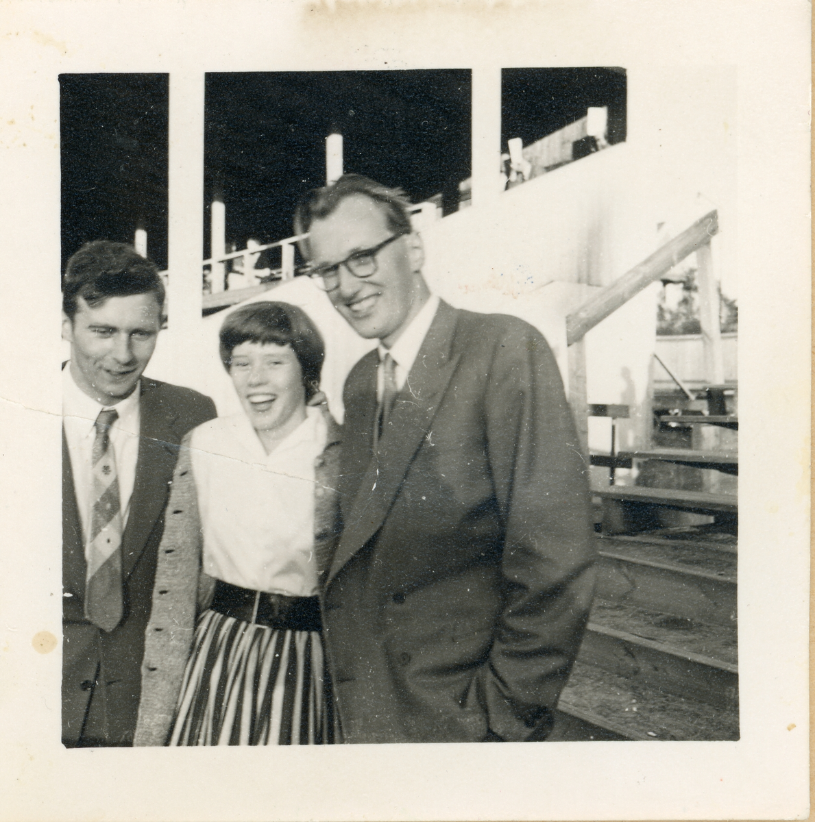 Fotografi på två män och en kvinna vid, som det ser ut, en arena.