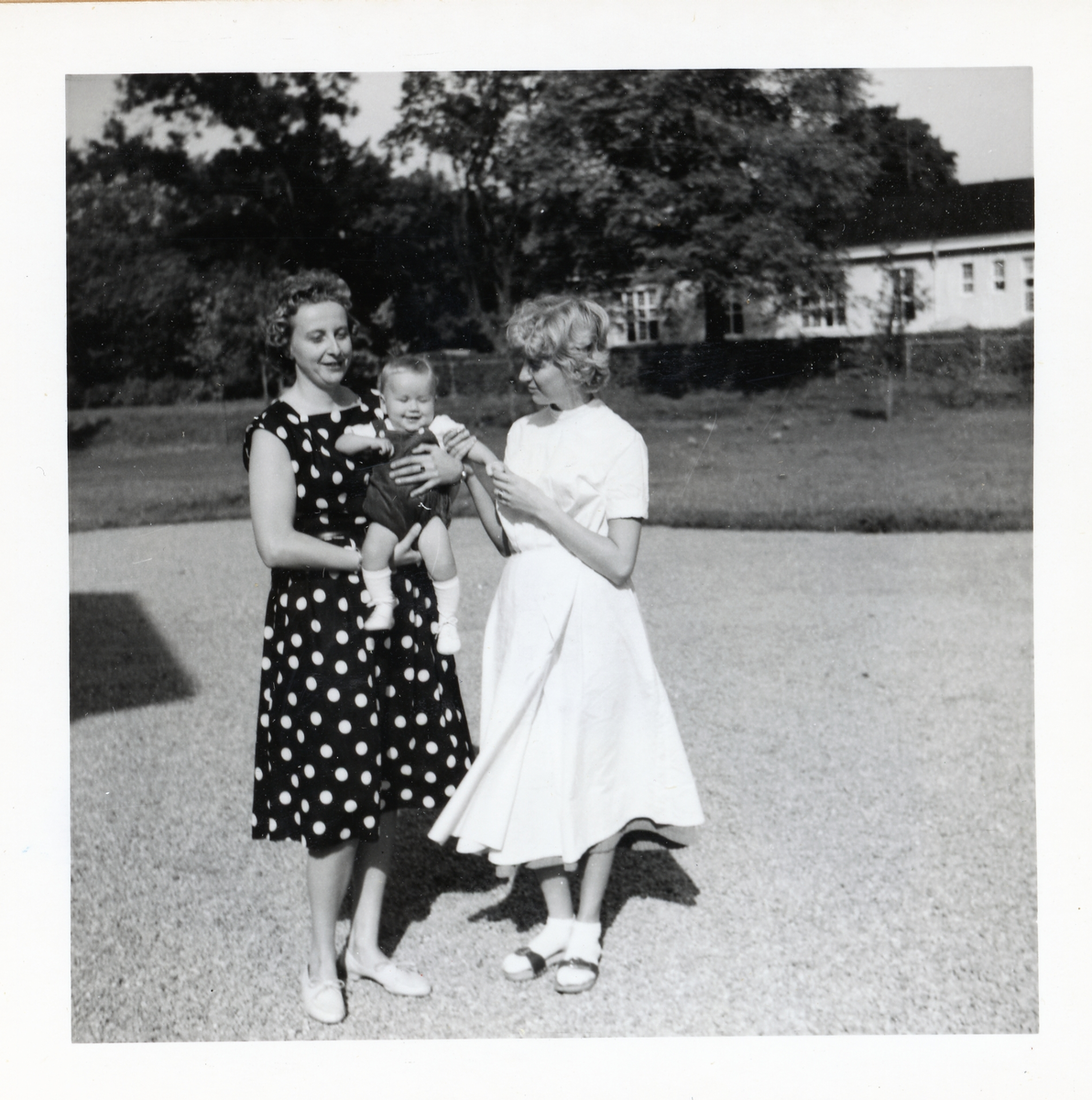 Titel: Fotografi på två kvinnor och Bengt-Åke 1 år, på en gårdsplan.